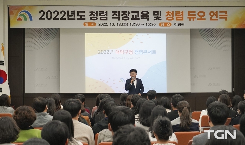 [TGN땡큐굿뉴스=오흥국 기자] 대전 대덕구(구청장 최충규)는 18일 구청 청렴관에서 전직원을 대상으로 특강 및 콘서트(연극) 등 참여형 프로그램으로 구성된 청렴 교육을 펼쳤다.