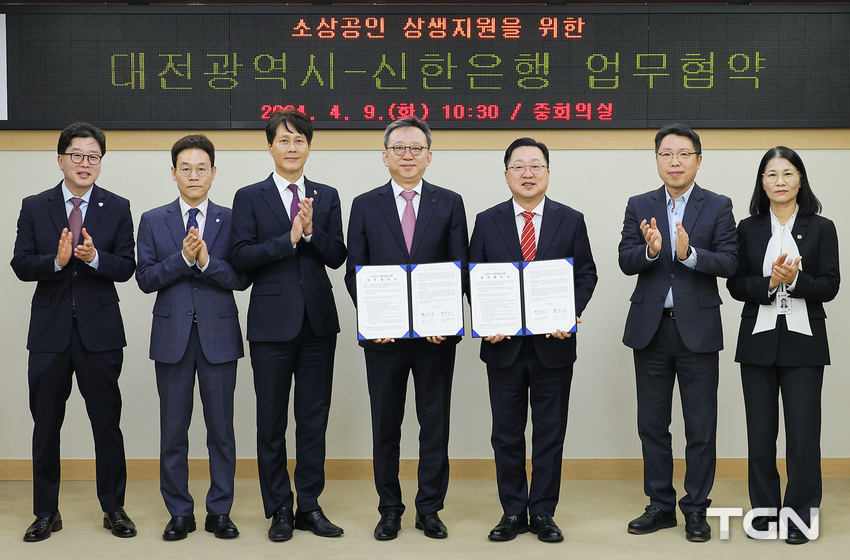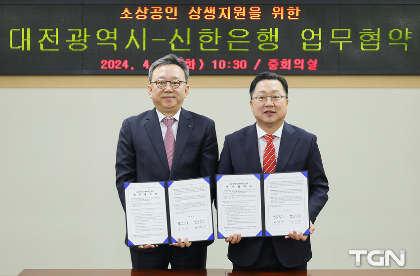(TGN 땡큐굿뉴스=김정은 기자) 대전시와 신한은행은 9일 대전시청 중회의실에서 이장우 대전시장과 정상혁 신한은행장이 참석한 가운데 신한은행‘땡겨요’배달앱을 활용한 ‘소상공인 상생지원 업무협약’을 체결했다.