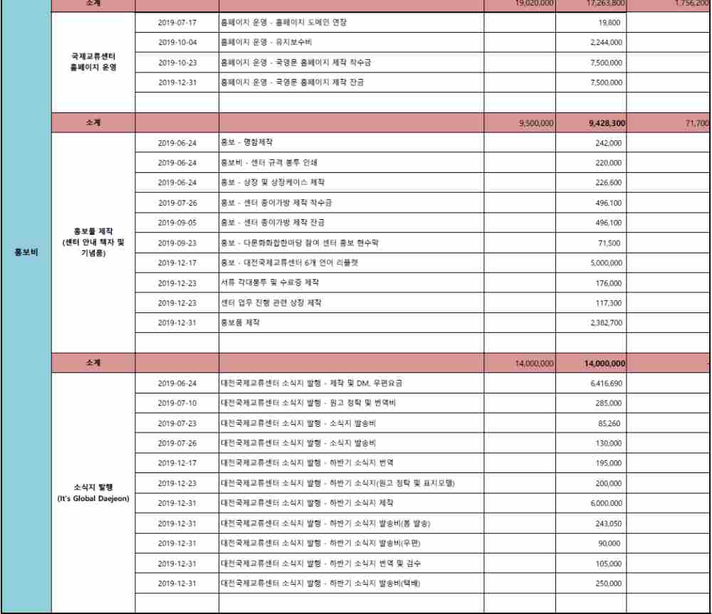 [TGN 대전] 대전광역시 국제교류센터( 이미숙 센터장)의 2019년 업무추진비및 홍보비 지출내역을 정보공개를 통해 받은 자료를 공개한다.