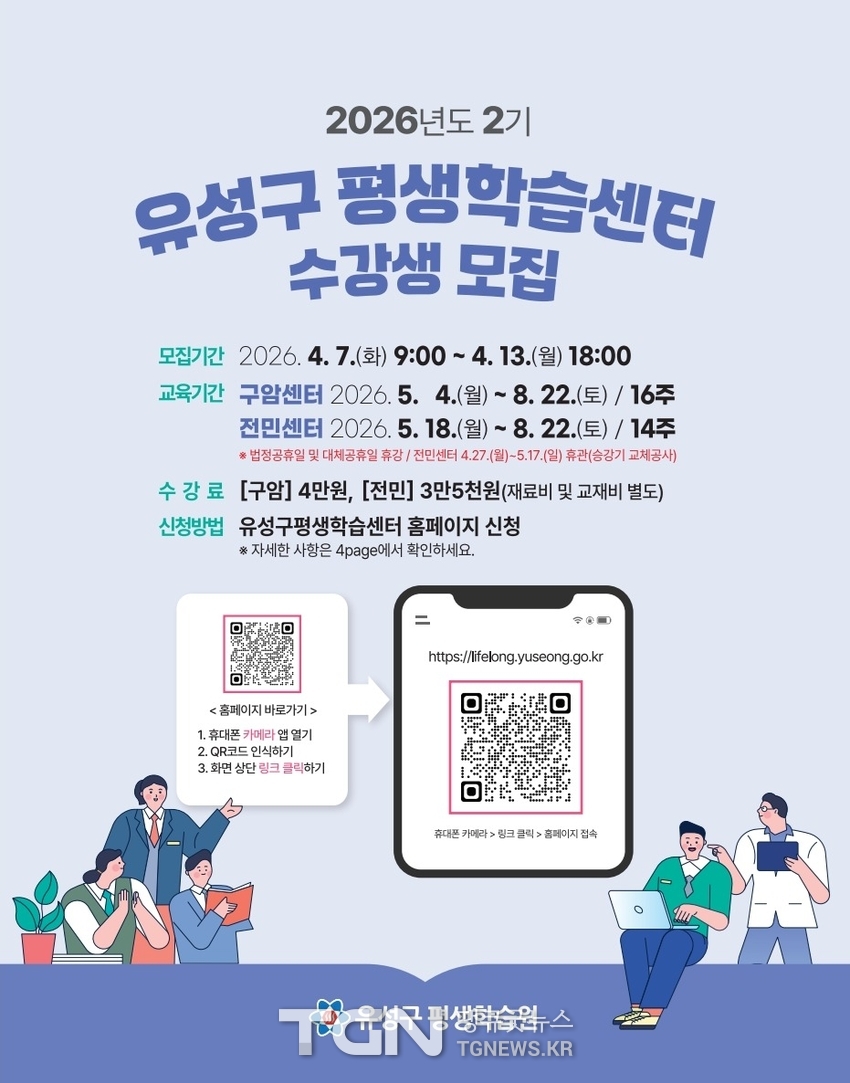 대전 유성구(구청장 정용래)는 오는 7일부터 13일까지 구암평생학습센터와 전민평생학습센터에서 ‘2026년 2기 평생학습센터’ 수강생을 모집한다.