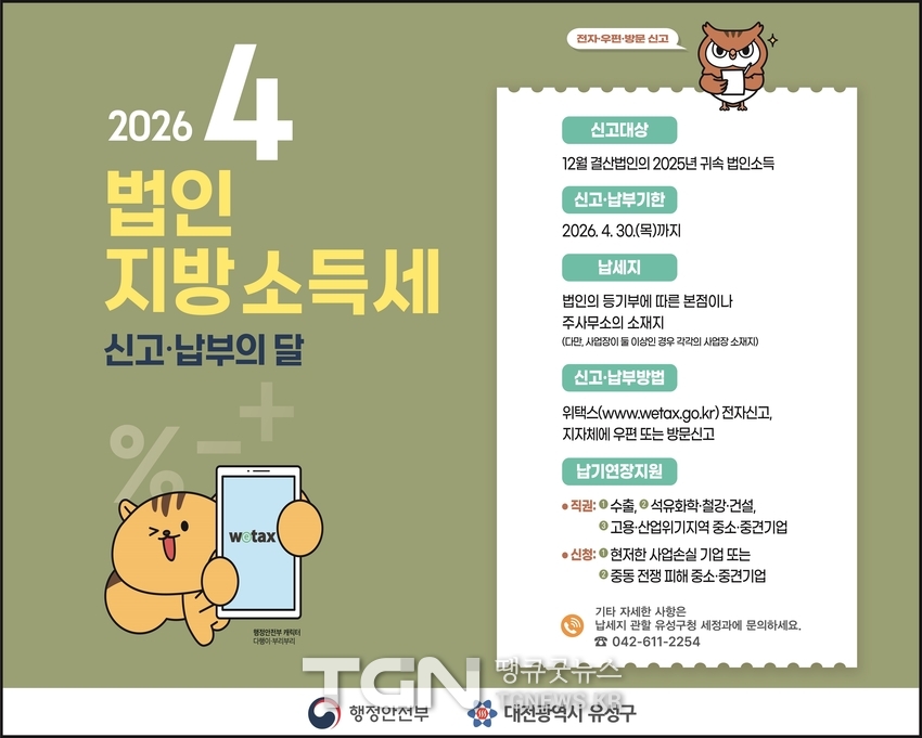 대전 유성구(구청장 정용래)는 오는 30일까지 2025년 귀속 법인지방소득세 신고납부 기간을 운영한다.