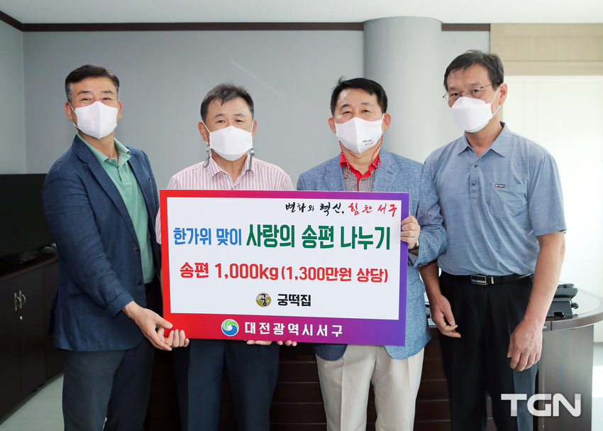 [TGN 대전.세종.충청=윤정애 기자] 대전 서구(구청장 서철모)는 관내 식품제조·가공업소 궁떡집(대표이사 구일회)으로부터 1,300만 원 상당의 송편 1,000㎏을 기탁받았다고 29일 밝혔다.