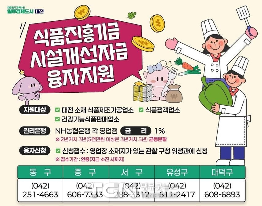 식품위생 수준을 향상하고 영업자의 경제적 부담을 덜어주기 위한 식품진흥기금 시설개선자금 융자 지원사업을 추진한다고 밝혔다. 융자 종류는 시설개선자금과 위생등급·모범업소 육성자금이다.