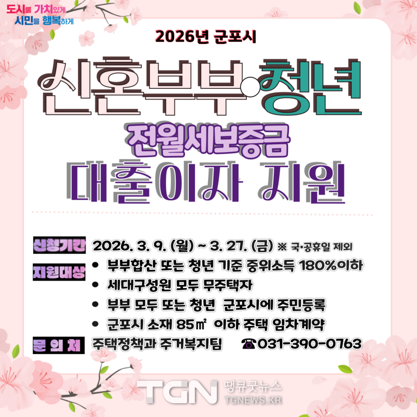 ( TGN 경기 = 김복수 기자 ) 군포시가 신혼부부와 청년들의 주거비 부담 경감과 안정적인 거주환경을 위해 2026년 군포시 신혼부부 및 청년 전월세 보증금 대출이자 지원사업 대상자를 모집한다고 밝혔다.