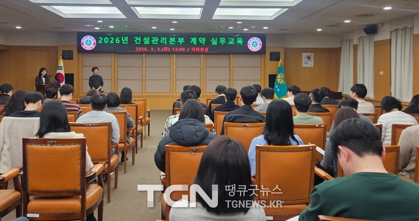 (TGN 대전=서유진 기자) 대전시 건설관리본부는 3일 시청 대회의실에서 계약담당자와 사업부서 담당자 등 60여 명이 참석한 가운데 건설공사 계약실무 교육을 실시했다.
