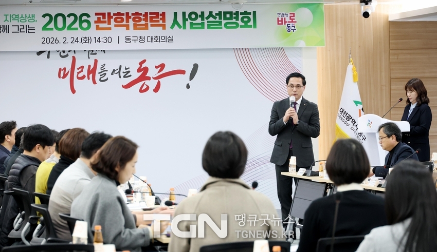 (TGN 대전=김정은 기자) 대전 동구(구청장 박희조)는 24일 동구청 대회의실에서 대전대학교, 우송대학교, 대전보건대학교, 우송정보대학, 한국폴리텍Ⅳ대학 대전캠퍼스 등 지역 내 5개 대학과 함께 ‘2026년 구-대학 연계 관학협력 사업설명회’를 개최했다고 밝혔다.