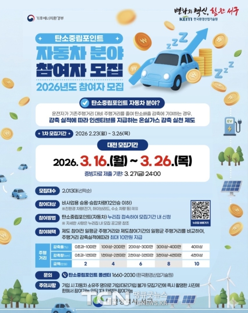 [TGN대전 심규권] 기자대전 서구는 온실가스 감축을 위해 3월 16일부터 26일까지 2026년 자동차 탄소중립포인트제 참여자를 모집한다고 13일 밝혔다.