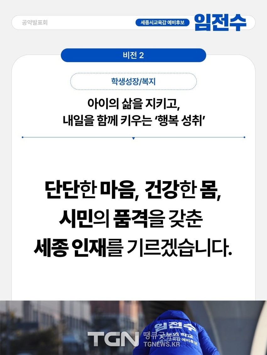 [TGN세종 심규권 기자] 임전수 세종시교육감 예비후보는 지난 16일 1차 공약발표에 이어 오늘 2차‘학생성장/복지’공약을 발표하였다.