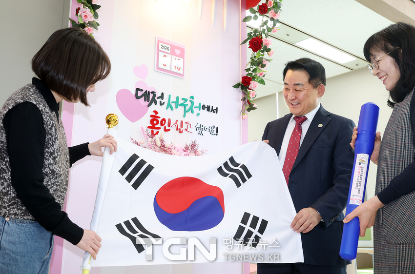 [TGN대전 심규권 기자]대전 서구는 혼인신고를 위해 구청을 방문한 국제결혼 부부에게 태극기를 증정한다고 20일 밝혔다.