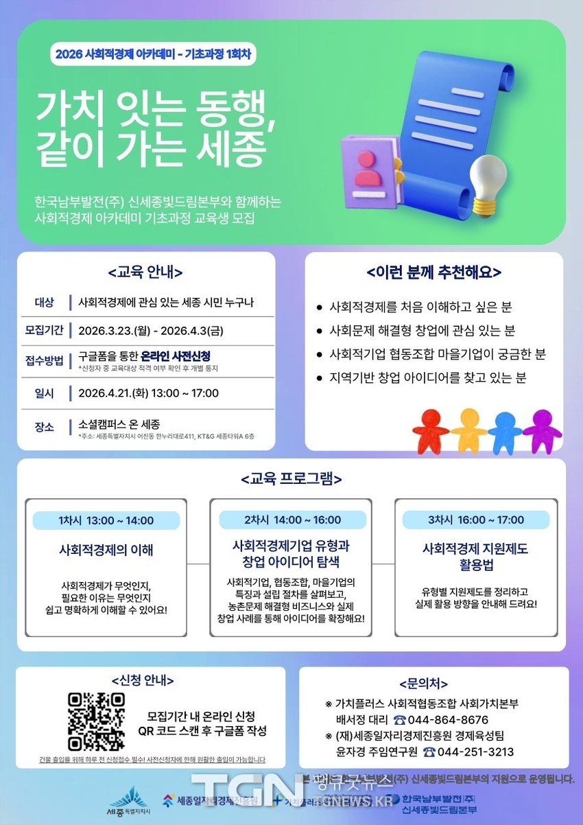 세종일자리경제진흥원(원장 이홍준)이 한국남부발전㈜ 신세종빛드림본부와 협력해 지역 내 사회적경제 인재를 발굴하고 창업을 지원하기 위한 ‘2026 사회적경제 아카데미’를 운영한다.