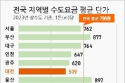 전국에서 가장 안정적인 물 공급이 가능해 가뭄과 단수조치가 없고, 수돗물값이 가장 저렴한 도시는 어디일까? 강릉시의 물부족 사태 장기화 및 이상기후 여파로 안정적인 물공급의 중요성이 높아지고 있는 이때, 대전의 수돗물값이 전국에서 가장 저렴하고 원수 및 정수 수질 또한 높은 수준인 것으로 나타나 관심을 모으고 있다. 환경부가 최근 공개한 상수도 통계 기준(2023년도) 「전국 지역별 수도요금 평균단가」에 따르면 대전의 평균 수도요금은 톤(㎥)당* 579원으로 전국 수돗물 평균 단가인 796원 보다 27%가 낮고 전국 17개 시․도 중 가장 저렴한 것으로 확인됐다. <도표1> * 수도요금단위 : 1톤(㎥) = 1,000L 이 같은 원인에 대해 대전시 상수도사업본부는 식수원인 대청호의 풍부한 수량과 깨끗한 원수, 그리고 우수한 정수처리 능력이 결합되어 수량, 수질, 가격의 삼박자를 갖춘 전국 최고의 물관리 역량 때문인 것으로 분석하고 있다. 대전 수도요금이 전국에서 가장 싼 이유 우선 수도요금이 전국에서 가장 저렴한 이유로는 첫째, 천혜의 청정 상수원인 대청호와 국내 총저수량 3위 규모인 대청댐(14.9억 톤)을 꼽을 수 있다. 금강수계인 대청호는 한