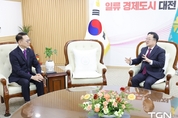 (TGN 땡큐굿뉴스=서유건 기자) 대전시는 61년 만에 신축 개장 예정인 새 야구장 명칭에 ‘대전’이라는 지역명을 넣은 “대전 한화생명 볼파크”로 명명하는 것으로 한화이글스와 최종 합의했다. 이장우 대전시장은 20일 오후 대전시청에서 박종태 ㈜한화이글스 대표이사를 만난 자리에서“대전시민의 요구사항에 대해 한화그룹 측에서 신속한 의사결정을 내려준 데 대해서 반갑게 생각하며, 대전시는 앞으로 준공, 개장 및 개막전 등 추후 일정에 차질이 없도록 한화이글스 측과 적극 협조하고 지원하겠다”라고 밝혔다. 박종태 ㈜한화이글스 대표이사는 “앞으로 팬들과 함께하는 지역 연고 프로야구단으로서, 대전시와 적극 협력하여 2025시즌 우수한 성적으로 보답하겠다”라고 전했다. 이장우 대전시장은 이어“새로운 야구장에서 2025시즌 한화이글스의 우승을 기원한다”라고 덧붙였다.