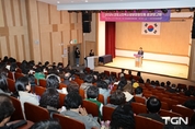(TGN 땡큐굿뉴스=김정은 기자) 민주평화통일자문회의 대전지역회의(부의장 김동원)는 11월 25일(월) 15시, 배재대학교 국제교류관 401호에서 자문위원 및 대학생 100여명이 참석한 가운데 「2024년 대전평화통일포럼」를 개최했다. 이날 포럼은 1부 개회식에서는 김동원부의장 개회사, 김욱 배재대학교총장 축사, 이재현 배재대 통일문제연구소장의 환영사에 이어, 2부는 이준건 포럼연구위원장 사회로 ‘8.15 통일독트린과 통일미래비전’라는 주제로 전영선건(건국대 연구교수)의 발제 후, 주서현(통일교육강사), 이장은(민주평통 유성구 자문위원), 김휘중(배재대 학생)이 지정토론 후 참여자 자유토론 순으로 진행됐다. 대전평화통일포럼은 김동원부의장이 대표를 겸임하며, 지역에서 평화통일 공론의 장을 형성하여 헌법정신에 기반한 통일담론 형성 및 청년세대의 통일공감대 확산을 위해 개최하며, 특히 21기부터 대전평화통일포럼은 지역의 청년세대의 통일공감대 확산을 위해 지역대학생을 찾아가는 포럼형식으로 추진하고 있다. 김부의장은 “통일미래세대의 주역인 대학생들이 통일에 대한 관심을 갖고 함께 참여하여 줌에 감사드리며, 자유·평화·번영의 통일 대한민국으로 나아가기 위한 ‘8,15