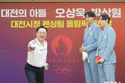 (TGN 땡큐굿뉴스=김정은 기자) 이장우 대전시장은 8일 오전 시청에서 대전 펜싱의 저력으로 파리올림픽 무대에서 세계를 제패하고 돌아온 대전시청 펜싱팀 소속 오상욱․박상원 선수를 만나 격려했다. 접견에 앞서 200여 명의 시청 직원들은 두 선수 도착시간에 맞춰 시청을 방문한 시민들과 함께 시청 로비에 모여 미리 준비한 환영 현수막 등을 펼치고 깜짝 환영 행사도 펼쳤다. 이 시장은 선수들에게 대전 0시 축제 굿즈인 모자와 티셔츠를 선물했고, 선수들은 파리올림픽에서 사용한 펜싱 칼에 사인을 담아 이 시장에게 선물했다. 이장우 대전시장은 “오상욱, 박상원 선수가 이룬 성취는 대전시민의 명예고 긍지가 됐다. 선수들의 성취에 소홀함이 없도록 두 선수에 대한 포상을 검토할 것”이라고 말했다. 이어 “우송대 펜싱부가 창단되면서 고교에서 대학 그리고 실업팀까지 연결되는 체육 시스템이 갖춰졌다”라며 “대전시는 2027 하계세계대학경기를 목표로 펜싱체육관 조성을 준비해 왔다. 파리올림픽에서 금메달을 따면 오상욱체육관으로 명명하겠다고 약속했는데 그 약속이 이뤄질 수 있게 돼서 기쁘다”라고 덧붙였다. 오상욱 선수는 “오상욱체육관을 지어주신다는 것에 어깨가 무거웠지만 그 힘으로 좋