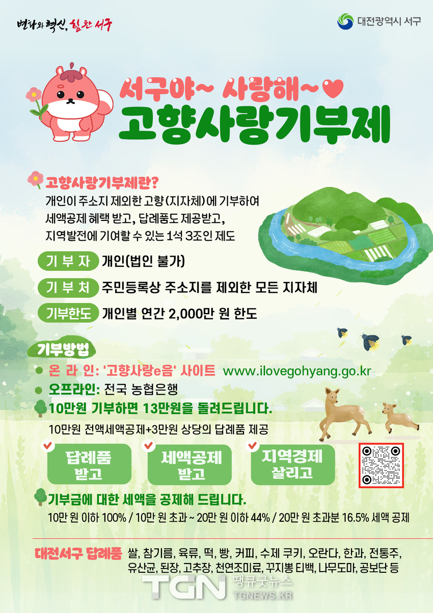 한편, 고향사랑기부제는 개인의 주민등록상 주소지를 제외한 다른 지방자치단체에 연간 최대 2,000만 원까지 기부할 수 있는 제도다. 기부자는 10만 원까지는 전액, 10만 원 초과 20만 원 이하는 44%, 20만 원 초과 시 16.5%의 세액공제를 받을 수 있다.