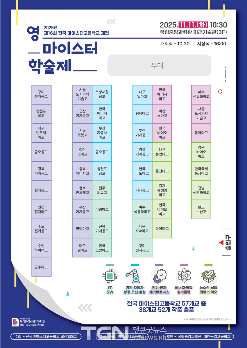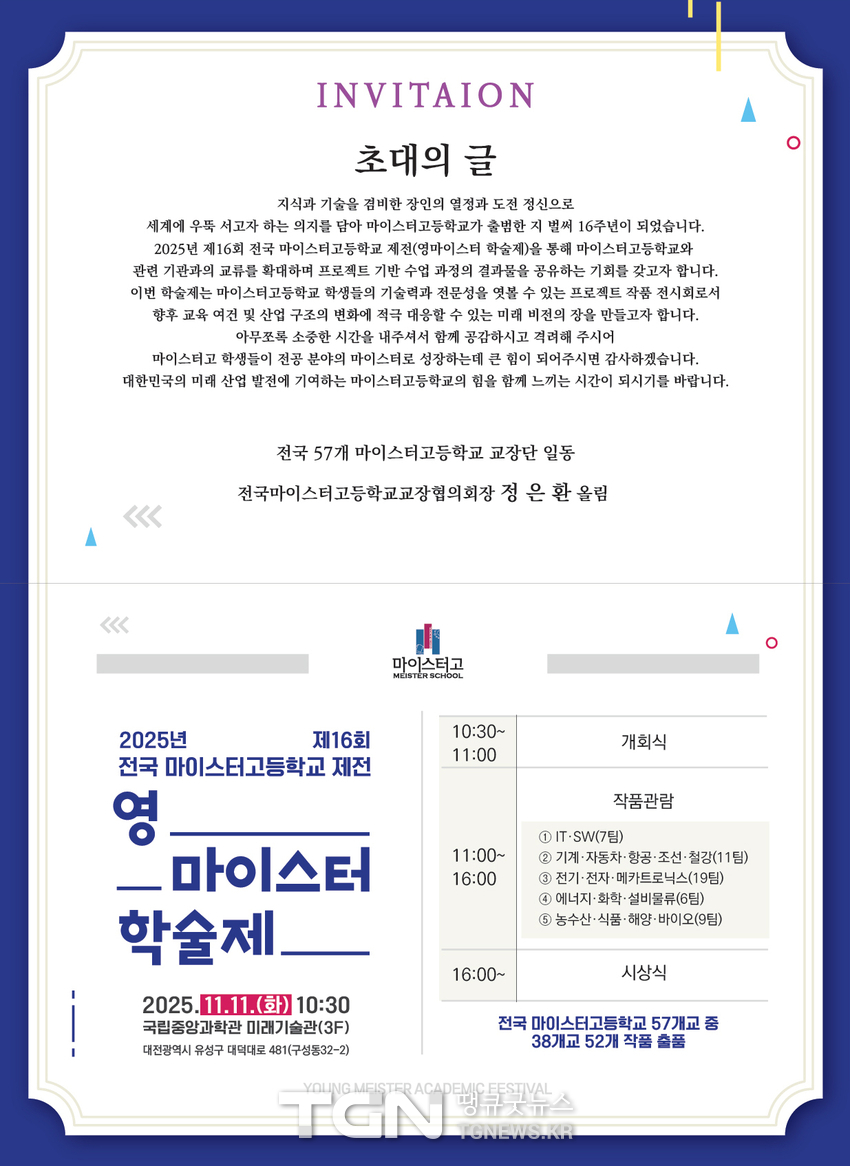 (TGN 땡큐굿뉴스=김정은 기자) 미래 산업을 이끌어갈 젊은 기술인재들의 축제, ‘제16회 전국 마이스터고등학교 제전 영 마이스터 학술제'가 오는 2025년 11월 11일(화) 오전 10시 30분, 대전국립중앙과학관 미래기술관(3층)에서 열린다.