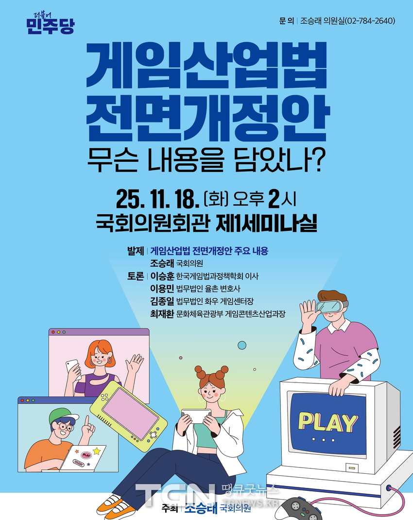 (TGN 땡큐굿뉴스=김정은 기자) 조승래 의원 ( 대전 유성구갑 , 더불어민주당 ) 이 오는 18 일 오후 2 시 , 국회 의원회관 제 1 세미나실에서 ‘ 게임산업법 전면개정안 , 무슨 내용을 담았나 ?’ 토론회를 개최한다 .