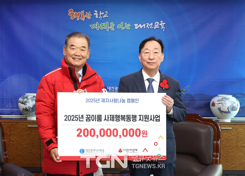 (TGN 땡큐굿뉴스=서유건 기자) 대전시교육청은 12월 4일 대전사회복지공동모금회로부터 긴급․위기학생 지원사업인「2025년 꿈이룸 사제행복동행」으로 추진한 모금액(2억원) 전달식을 진행했다고 밝혔다.
