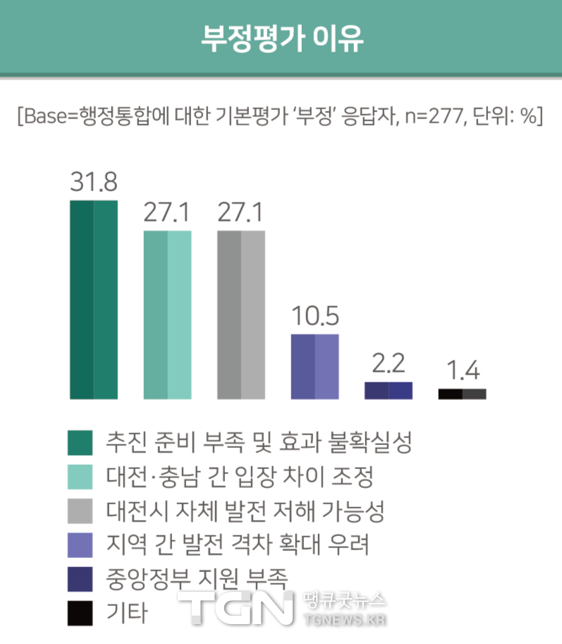 행정통합에 부정적이거나 신중한 태도를 보인 시민들은 추진준비 부족, 효과 불확실, 입장차이 조정 어려움 등을 우려했다. 특히 30대의 부정적 반응이 컸다.