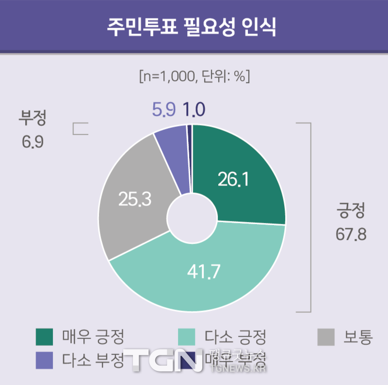 또한, 대전 시민들은 행정통합 여부는 주민투표로 결정해야 한다고 판단했다. ‘주민투표 필요성’을 묻는 항목에서 긍정 67.8%, 부정 6.9%, 보통 25.3%로 각각 응답했다. 이밖에 설명회·토론회·온라인 의견제출 등 ‘공론화 활동에 참여 의향’에 대해서는 긍정 37.8%, 부정 19.1%, 보통 43.1%로 답변했다.