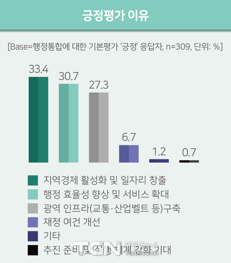 행정 통합을 긍정적으로 평가하는 이유로 △지역경제 활성화 및 일자리 창출(33.4%) 응답이 제일 많았다. 이어 △행정 효율성 향상 및 서비스 확대(30.7%) △광역 인프라(교통·산업벨트 등) 구축(27.3%) △재정 여건 개선(6.7%) △추진 준비 및 실행 체계 강화 기대(0.7%) 등의 순으로 꼽았다.