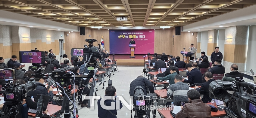 ( TGN 경기 = 김복수 기자 ) 군포시는 1월 15일 시청에서 기자간담회를 열고 2026년 시정운영 목표와 주요 추진 과제를 설명했다.