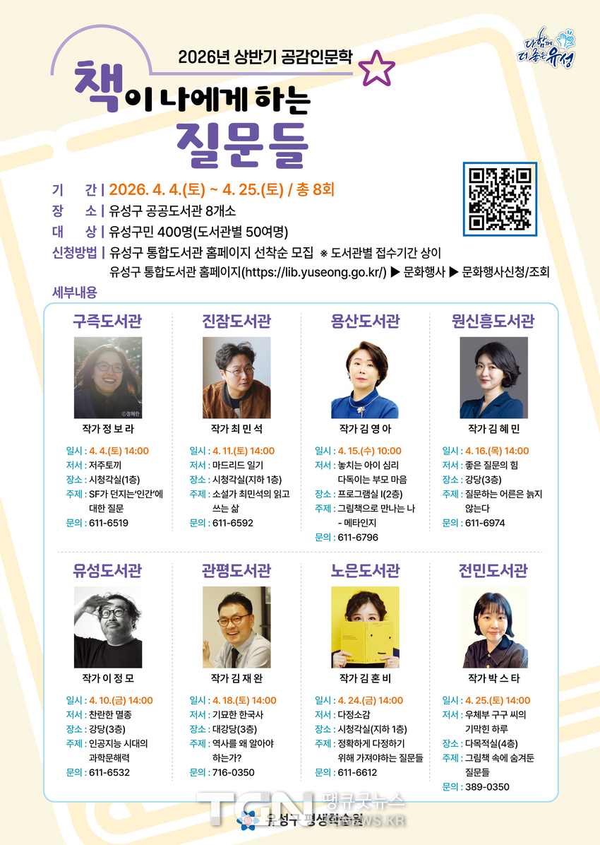 대전 유성구(구청장 정용래)는 4월 한 달간 관내 8개 공공도서관에서 도서관의 날·도서관 주간을 맞아 ‘2026년 상반기 공감인문학 강연’을 운영한다.