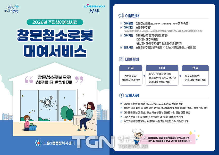 [TGN 대전 심규권기자] 대전 유성구(구청장 정용래)는 노은3동 행정복지센터에서 ‘창문청소로봇’ 물품 대여 사업을 운영한다고 16일 밝혔다.