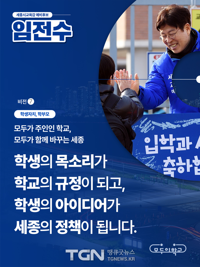 [TGN세종 심규권 기자] 임전수 세종시교육감 예비후보는 지난 16일 1차 공약발표(교육과정,수업혁신,학력강화)와 17일 2차 공약발표(학생성장/복지)에 이어 오늘 3차‘학생자치/학부모’공약을 발표하였다.