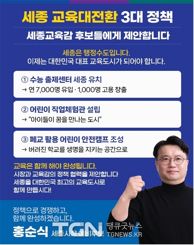 세종시장 선거에 출마한 홍순식 예비후보는 세종시 교육의 질적 도약을 위한 ‘세종 교육대전환 3대 정책’을 제안하고, 차기 세종교육감 후보들에게 정책 협력을 공식 요청했다.