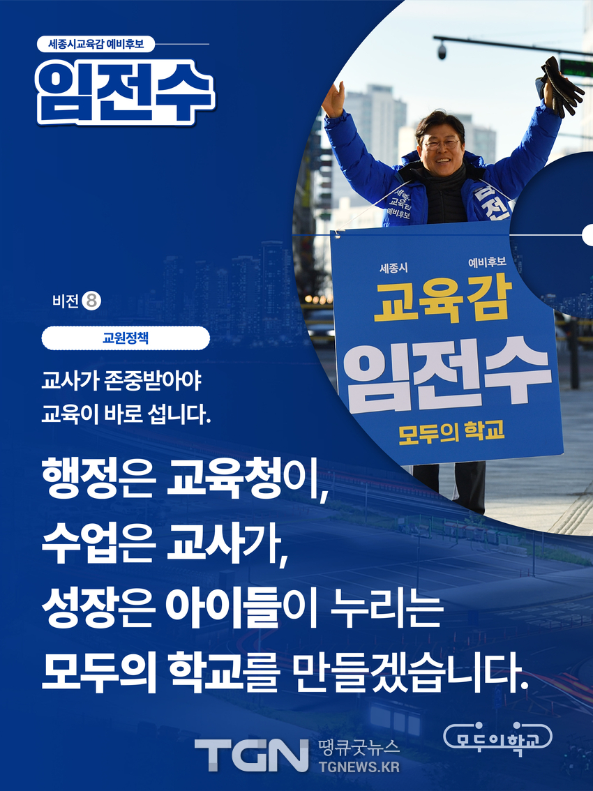 임전수 세종시교육감 예비후보는 “행정은 교육청이, 수업은 교사가”라는 원칙 아래, 교사가 불안 없이 아이들과 함께할 수 있는 세종을 만들겠다고 강조했다.