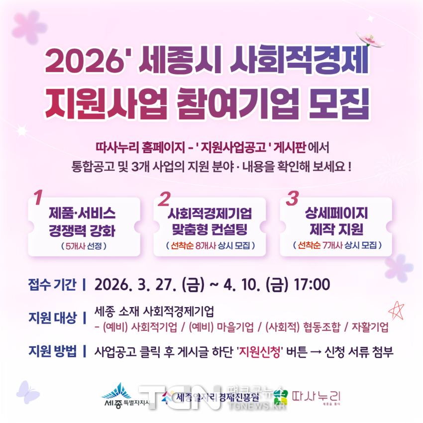 사업 참여를 희망하는 기업은 오는 4월 10일까지 세종시 사회적경제 플랫폼 따사누리를 통해 신청하면 된다. 자세한 사항은 세종일자리경제진흥원 누리집과 따사누리를 통해 확인할 수 있다.
