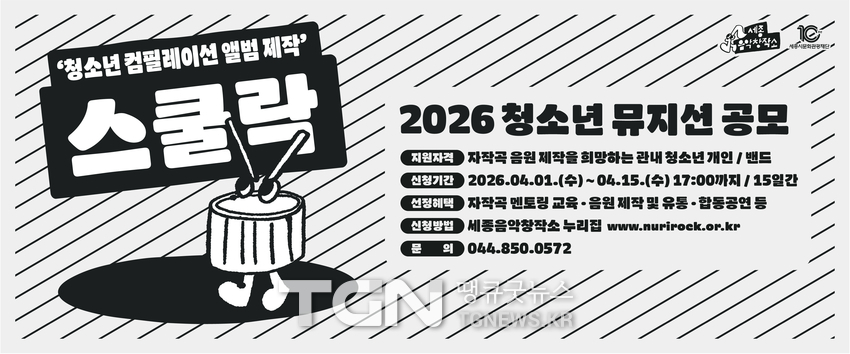 세종시문화관광재단(대표이사 박영국)은 오는 4월 15일까지 청소년 음반제작 지원사업 ‘스쿨락’에 참여할 청소년을 모집한다.