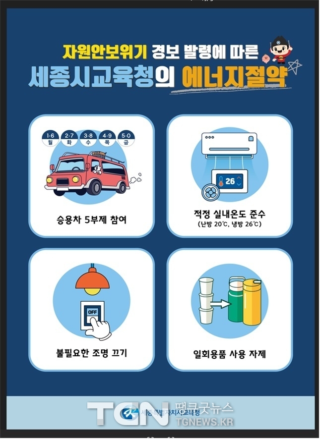 최근 글로벌 원유 및 천연가스 공급망 불안정으로 국가적인 자원 수급에 어려움이 가중되는 가운데, 세종시교육청 산하기관 전체가 에너지 절약과 고통 분담에 동참한다.