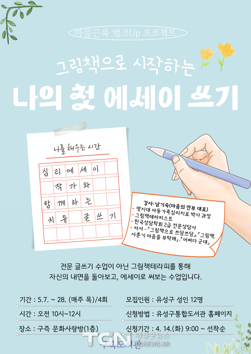 대전 유성구(구청장 정용래)는 5월 7일부터 28일까지 구즉도서관에서 성인을 대상으로 ‘마음근육 벌크UP 프로젝트–그림책으로 시작하는 나의 첫 에세이 쓰기’ 프로그램을 운영한다.