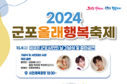 2024 군포올래 행복축제가 10월 4일과 5일 군포시 일원에서 펼쳐진다. 군포시는 지난 해 부터 독서대전을 비롯해 7개 축제를 통합해 책·문화·예술·공연이 함께하는 ‘모두 모여 행복한 All 來 행복축제’로 연다. 축제는 군포시가 주최하고 (재)군포문화재단, (사)예총군포지회, (사)문인협회 군포시지부, 군포공예문화협회, 군포시작은도서관협의회가 주관한다. 군포시민의 날 기념식 및 축하공연은 10월 4일(금) 18:30~21:00 시민체육광장에서 열린다. 군포시민의날 기념식과 군포시민대상 시상식이 열린다. 기념식 후에는 축하공연이 김현욱 아나운서의 진행으로 예정돼있다. 효린, 박서진, 박건우, 한담희, 버블엑스 등이 초대가수로 출연할 예정이고 대북퍼포먼스와 드론라이트 쇼가 펼쳐진다. 제10회 군포독서대전은 5일(토) 10:00~18:00 산본로데오거리(중앙분수대~산본역 방향)에서 펼쳐진다. 사전행사로 독서 골든벨, 인문학 특강, 작품전시 등이 예정되어 있고 독서체험과 시정 홍보부스 등이 운영될 예정이다. 평생학습 축제는 5일(토) 10:00~18:00 산본로데오거리(중앙분수대~세종아파트 방향)에서 동아리 참여 체험 프로그램, 전시, 학습놀이 등을 진행한다.
