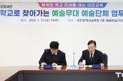 (TGN 땡큐굿뉴스=김정은 기자) 대전광역시교육청(교육감 설동호)은 1월 31일(수) 14:00, 대전지역 20개 예술단체와 ‘학교로 찾아가는 예술무대’ 추진을 위한 업무협약을 체결하였다. 이번 협약은 ’2024년 학교로 찾아가는 예술무대‘의 원활한 운영과 지역 예술인과의 협업을 통한 학교예술교육 활성화를 도모하기 위해 실시되었다. 「학교로 찾아가는 예술무대」는 2015년 음악공연 중심의 ’찾아가는 음악회‘로 시작되어 2018년 미술, 무용, 연극 등 분야가 확대되면서 ’학교로 찾아가는 예술무대‘로 사업 명칭이 변경되었으며 작년까지 총 476교에서 예술 무대가 실시되었다. 올해에는 초ㆍ중ㆍ고 80교에 1억 4천 4백만 원의 사업비를 지원하여, 예술단체의 오페라, 퓨전국악, 연극, 비보잉, 서예퍼포먼스 등 다양하고 수준 높은 예술문화를 제공함으로써 교육적 효과뿐만 아니라, 학생 참여와 체험을 통해 학생들의 눈과 귀를 즐겁게 할 프로그램으로 구성·운영할 계획이다. 림스 타악기 앙상블 고길영 대표는 “학교로 찾아가는 예술무대 공연을 통해 학생들의 문화예술 감수성을 높이고, 다양한 문화예술 경험이 제공될 수 있도록 노력하겠다.”라고 말했다. 설동호 대전광역시교육감은