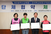 (TGN 땡큐굿뉴스=김정은 기자) 대전광역시교육청(교육감 설동호)과 전국학교비정규직연대회의(전국공공운수노조 교육공무직 본부, 전국학교비정규직노조, 전국여성노조)는 11월 24일 16시 30분 대전광역시교육청 중회의실(6층)에서 2023년 단체협약 체결식을 개최하였다. 이번 단체협약 체결을 통하여 그동안 교육청과 노조 간 쟁점사항을 둘러싼 갈등이 해결됨으로써 노조 파업으로 인하여 학사운영에 지장을 초래했던 부분이 모두 해소되었고, 향후 2년간 단체협약이 유효기간이 유지됨에 따라 노사 상생의 기틀을 마련하게 되었다. 체결식에는 설동호 대전광역시교육감을 비롯하여 기획국장, 행정국장, 담당과장과 전국학교비정규직연대회의 교섭대표 박미향, 김미경, 최순임 등 노조교섭위원 각각 10명씩 20명이 참석하였다. 이번 단체협약은 2019년 6월부터 2023년 11월까지 총 48차례에 걸쳐 교섭을 진행하여 합의안을 도출했으며, 전문, 본문 14장 99조, 부칙 11조로 총 111조 항의 합의사항이 담겨 있고, 세부내용은 ▲장기재직휴가 신설(재직연수 10년 이상 5일, 재직연수 20년 이상 10일) ▲육아시간 2시간 사용 ▲방학 중 비근무자 개학준비일 연 10일 보장 ▲유급병가